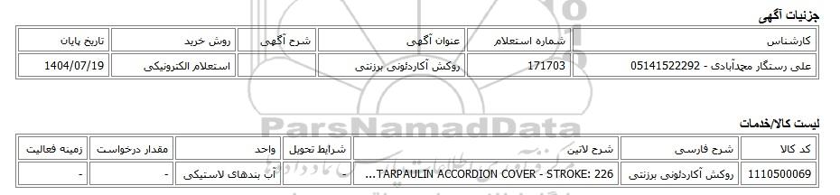 علی رستگار محمدآبادی - 05141522292 | 171703 | روکش آکاردئونی برزنتی | استعلام الکترونیکی | 1404/07/19 |