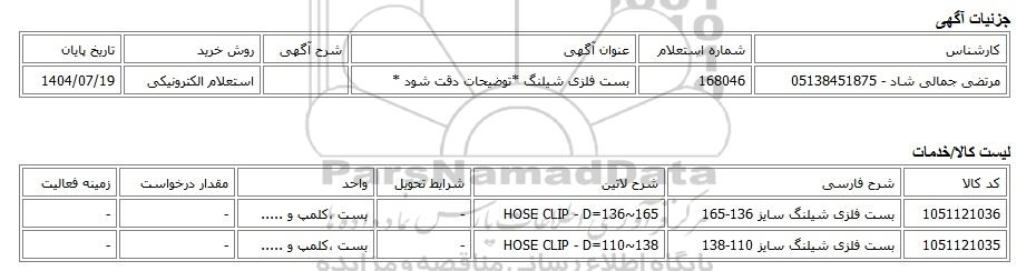 مرتضی جمالی شاد - 05138451875 | 168046 | بست فلزی شیلنگ *توضیحات دقت شود * | استعلام الکترونیکی | 1404/07/19 |
