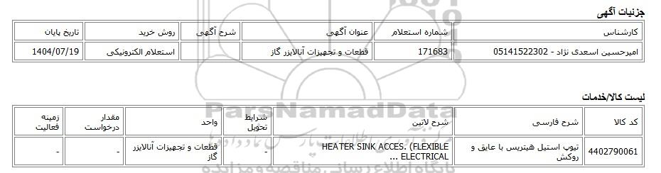 امیرحسین اسعدی نژاد - 05141522302171683قطعات و تجهیزات آنالایزر گازاستعلام الکترونیکی1404/07/19