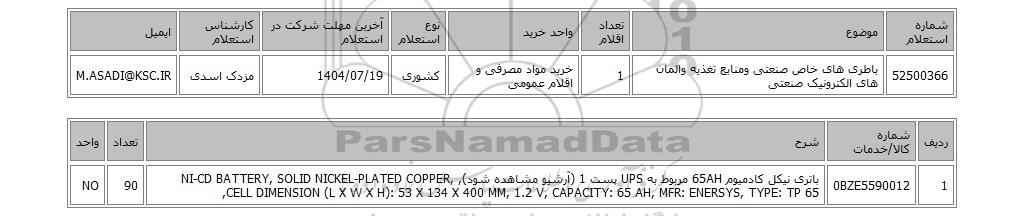 52500366 | باطری های خاص صنعتی ومنابع تغذیه والمان های الکترونیک صنعتی | 1 | خرید مواد مصرفی و اقلام عمومی | کشوری | 1404/07/19 | مزدک اسدی | M.ASADI@KSC.IR |