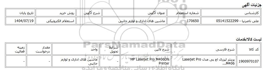 علی ناصرنیا - 05141522299 | 170650 | ماشین های اداری و لوازم جانبی | استعلام الکترونیکی | 1404/07/19 |