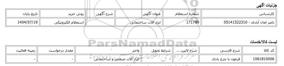 ناصر امان آبادی - 05141522310 | 171789 | ابزار الات ساختمانی | استعلام الکترونیکی | 1404/07/19 |