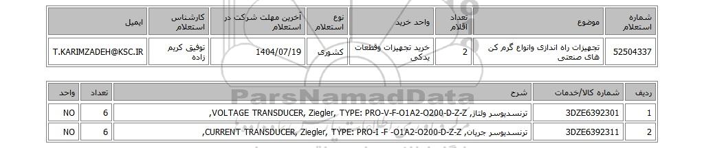 52504337 | تجهیزات راه اندازی وانواع گرم کن های صنعتی | 2 | خرید تجهیزات وقطعات یدکی | کشوری | 1404/07/19 | توفیق کریم زاده | T.KARIMZADEH@KSC.IR |