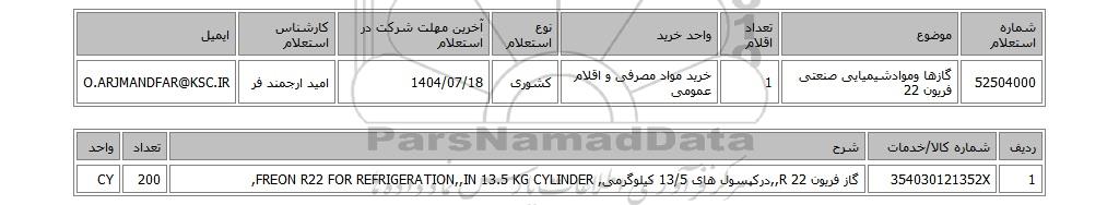 استعلام گازها وموادشیمیایی صنعتی فریون 22, استعلام گازها وموادشیمیایی صنعتی فریون 22