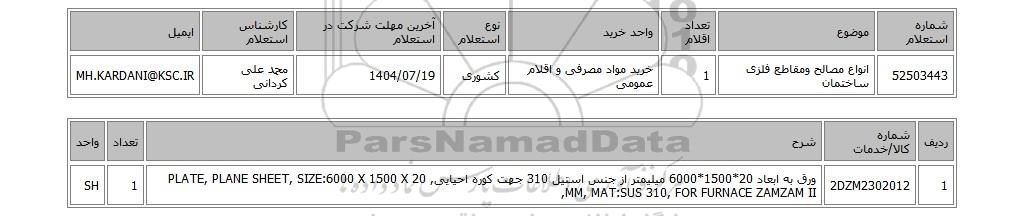 12DZM2302012ورق به ابعاد 20*1500*6000 میلیمتر از جنس استیل 310 جهت کوره احیایی, PLATE, PLANE SHEET, SIZE:6000 X 1500 X 20 MM, MAT:SUS 310, FOR FURNACE ZAMZAM II,1SH