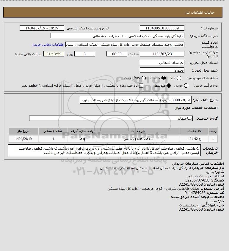شرح کلی نیاز: اجرای 3000 مترمربع آسفالت گرم روستای ارکان از توابع شهرستان بجنورد