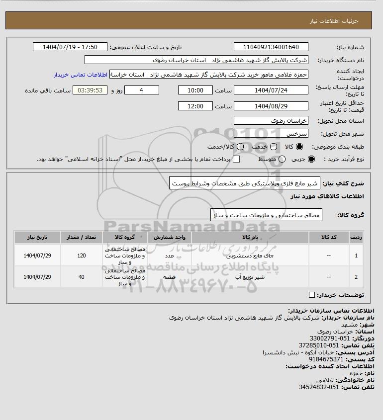 شرح کلی نیاز: شیر مایع فلزی وپلاستیکی طبق مشخصات وشرایط پیوست