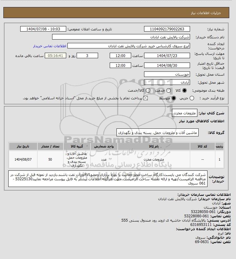 | 1 | -- | ملزومات مخزن | عدد | ماشین آلات و ملزومات حمل، بسته بندی و نگهداری | 50 | 1404/08/07 |