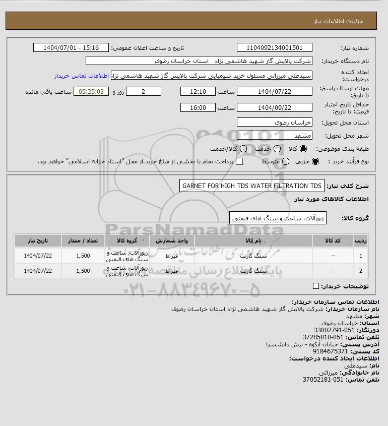 شرح کلی نیاز: GARNET FOR HIGH TDS WATER FILTRATION TDS