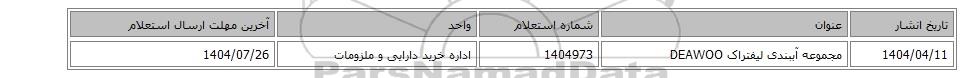 | 1404/04/11 | مجموعه آببندی لیفتراک DEAWOO | 1404973 | اداره خرید دارایی و ملزومات | 1404/07/26 |