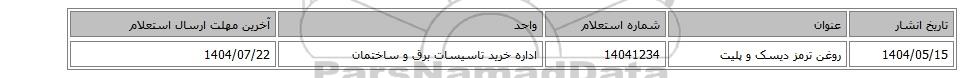 1404/05/15روغن ترمز دیسک و پلیت14041234اداره خرید تاسیسات برق و ساختمان1404/07/22