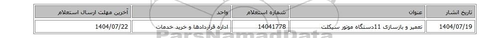 1404/07/19تعمیر و بازسازی 11دستگاه موتور سیکلت14041778اداره قراردادها و خرید خدمات1404/07/22