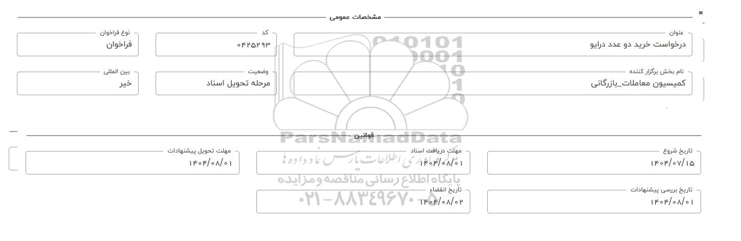 تاریخ شروع: 1404.07.15 - مهلت دریافت اسناد: 1404.08.01. - مهلت تحویل پیشنهادات: 1404.08.01