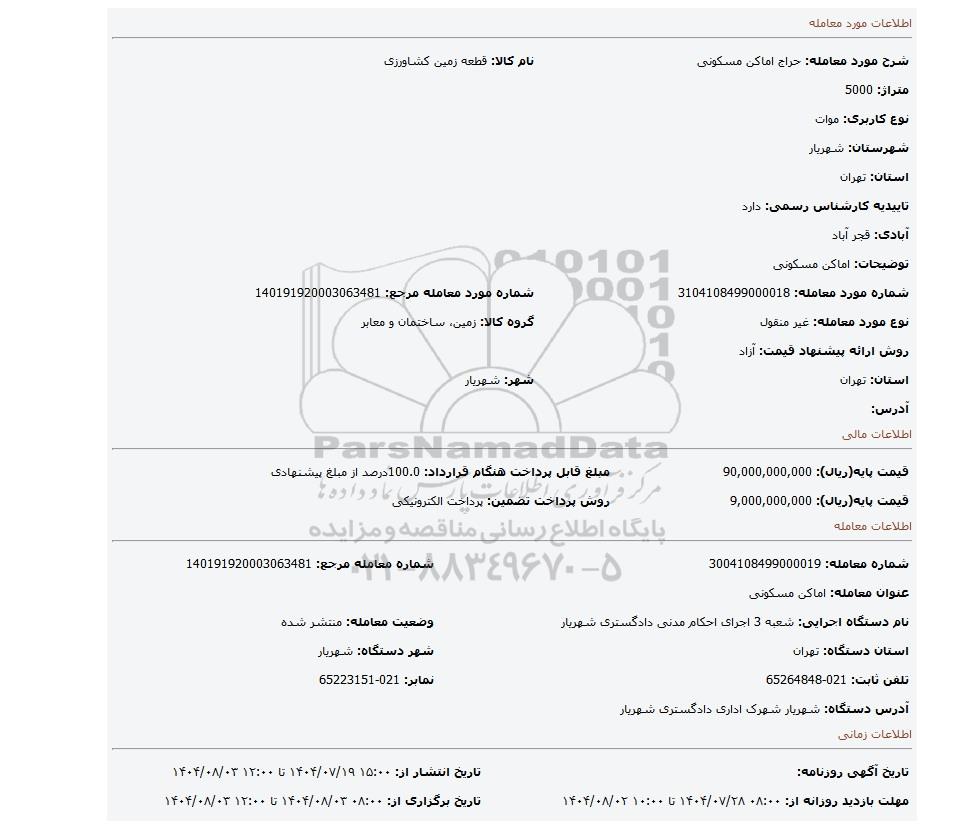 قیمت پایه(ریال): 9,000,000,000روش پرداخت تضمین: پرداخت الکترونیکی