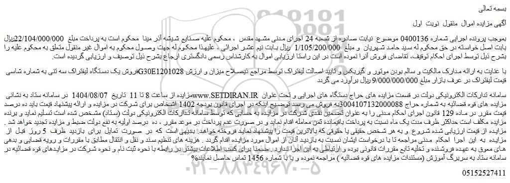 آگهی مزایده اموال منقول نوبت اول
