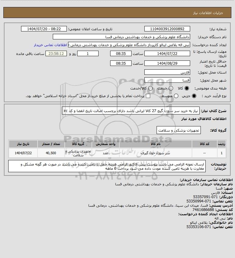 شرح کلی نیاز: نیاز به خرید سر سوزن گیج 27