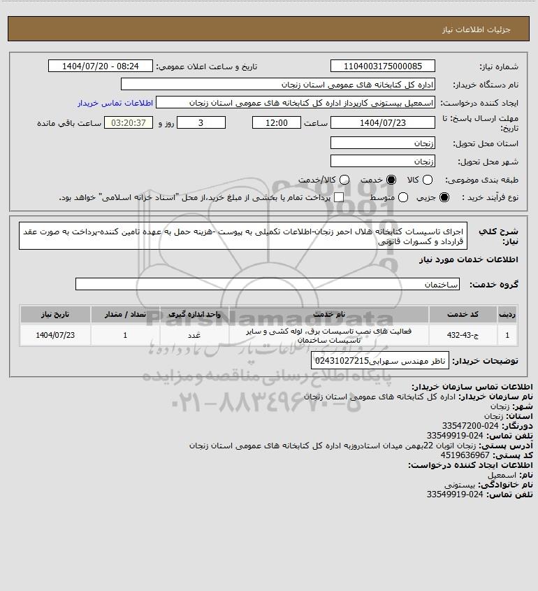 شرح کلی نیاز: اجرای تاسیسات کتابخانه هلال احمر زنجان-اطلاعات تکمیلی به پیوست -هزینه حمل به عهده تامین کننده-پرداخت به صورت عقد قرارداد و کسورات قانونی