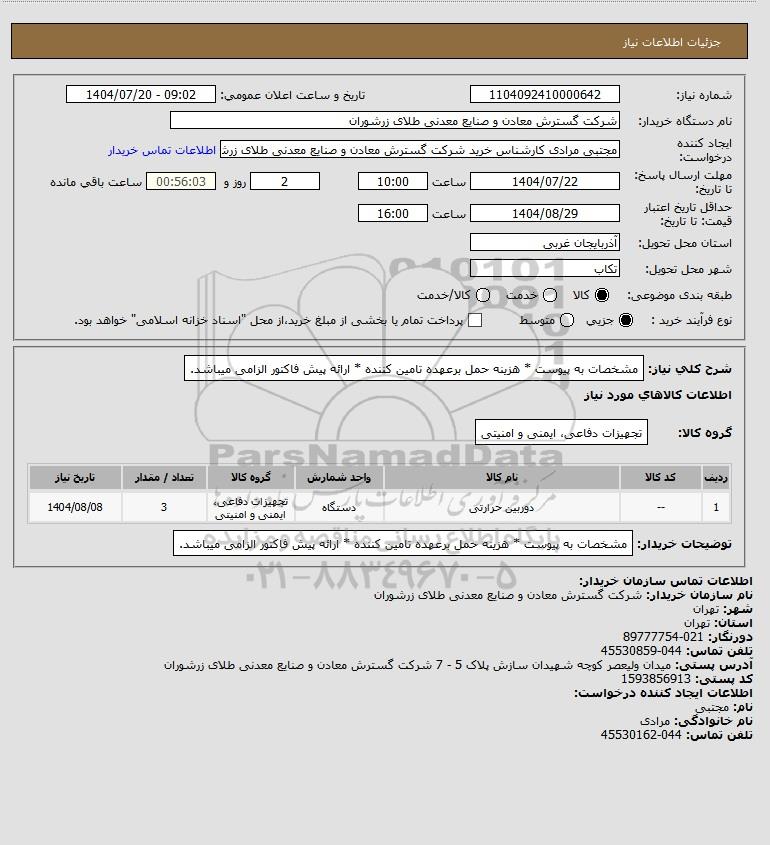 نام دستگاه خریدار:شرکت گسترش معادن و صنایع معدنی طلای زرشوران
