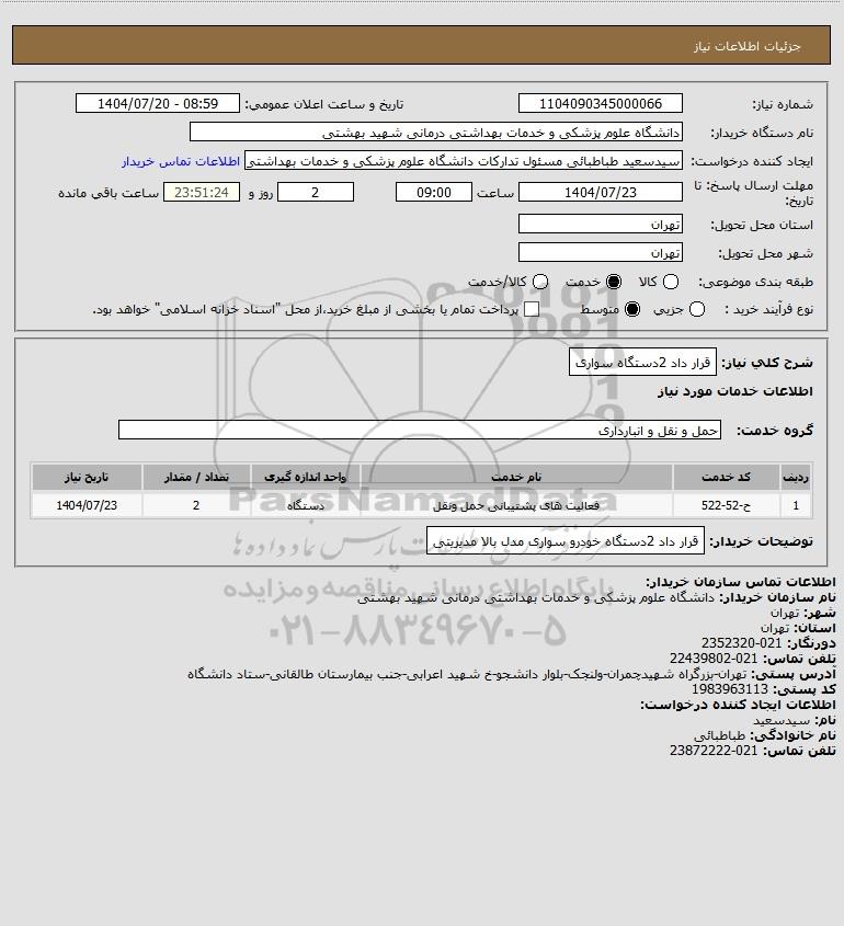 شرح کلی نیاز: قرار داد 2دستگاه سواری