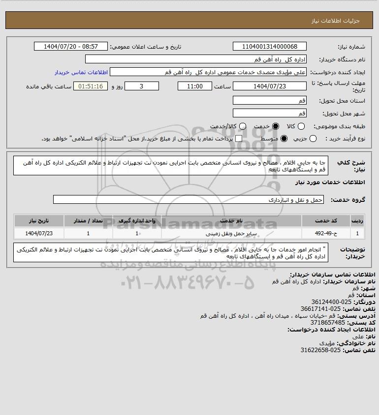 شرح کلی نیاز: جا به جایی اقلام ، مصالح و نیروی انسانی متخصص بابت اجرایی نمودن نت تجهیزات ارتباط و علائم الکتریکی اداره کل راه آهن قم و ایستگاههای تابعه