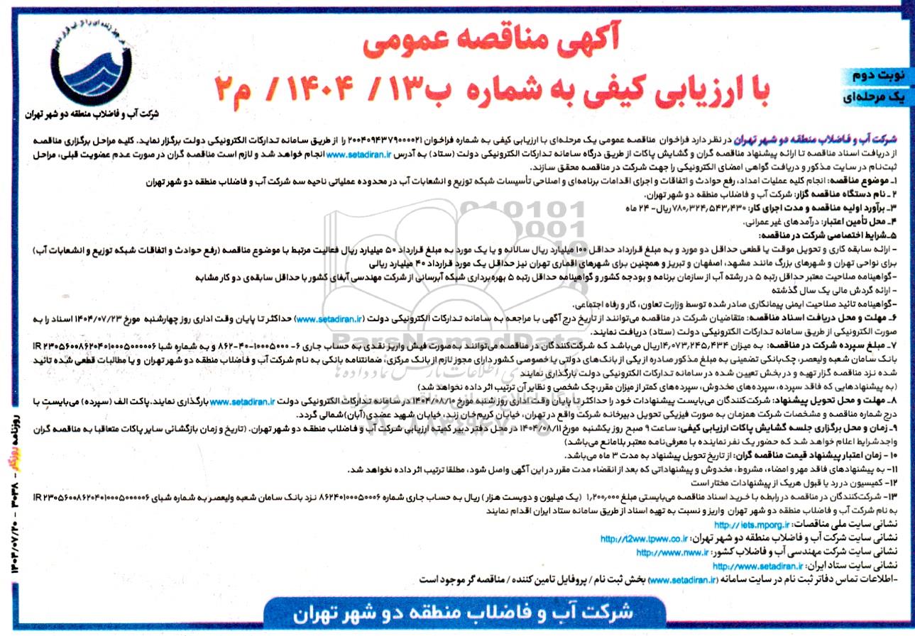 آگهی مناقصه عمومی با ارزیابی کیفی به شماره ب 13 / 1404 / م2