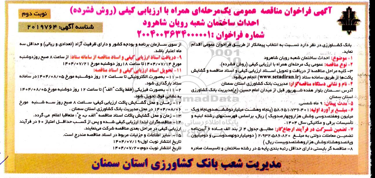 احداث ساختمان شعبه رویان شاهرود - نوبت دوم - شناسه آگهی: 2019764