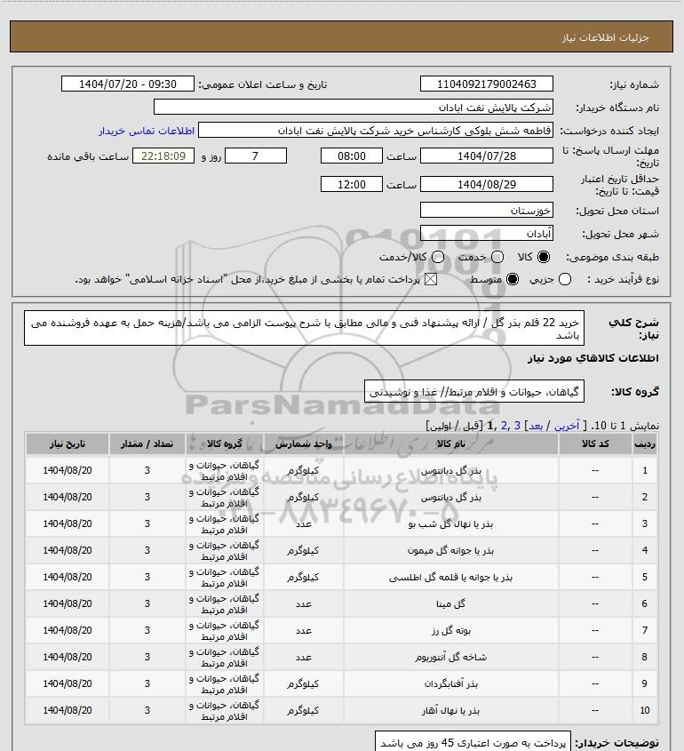 شرح کلی نیاز: خرید 22 قلم بذر گل / ارائه پیشنهاد فنی و مالی مطابق با شرح پیوست الزامی می باشد/هزینه حمل به عهده فروشنده می باشد