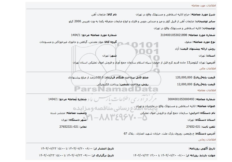 | توضیحات: اثاثیه اسقاطی و مستهلک واقع در تهران | ||