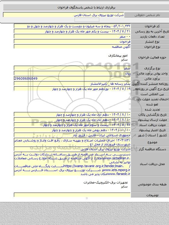 مناقصه ۱۴۰۴۱۷۴۱ اجرای عملیات اصلاح و بهینه سازی رفع افت ولتاژ و روشنایی معابر شهرستان فیروزآباد از محل اع از کلیه افراد متخصص و شرکتها واجد شرایط دعوت به عمل میآید در مناقصه با کد خبرگزاری پارس نماد: 9683085 شرکت نمایند.