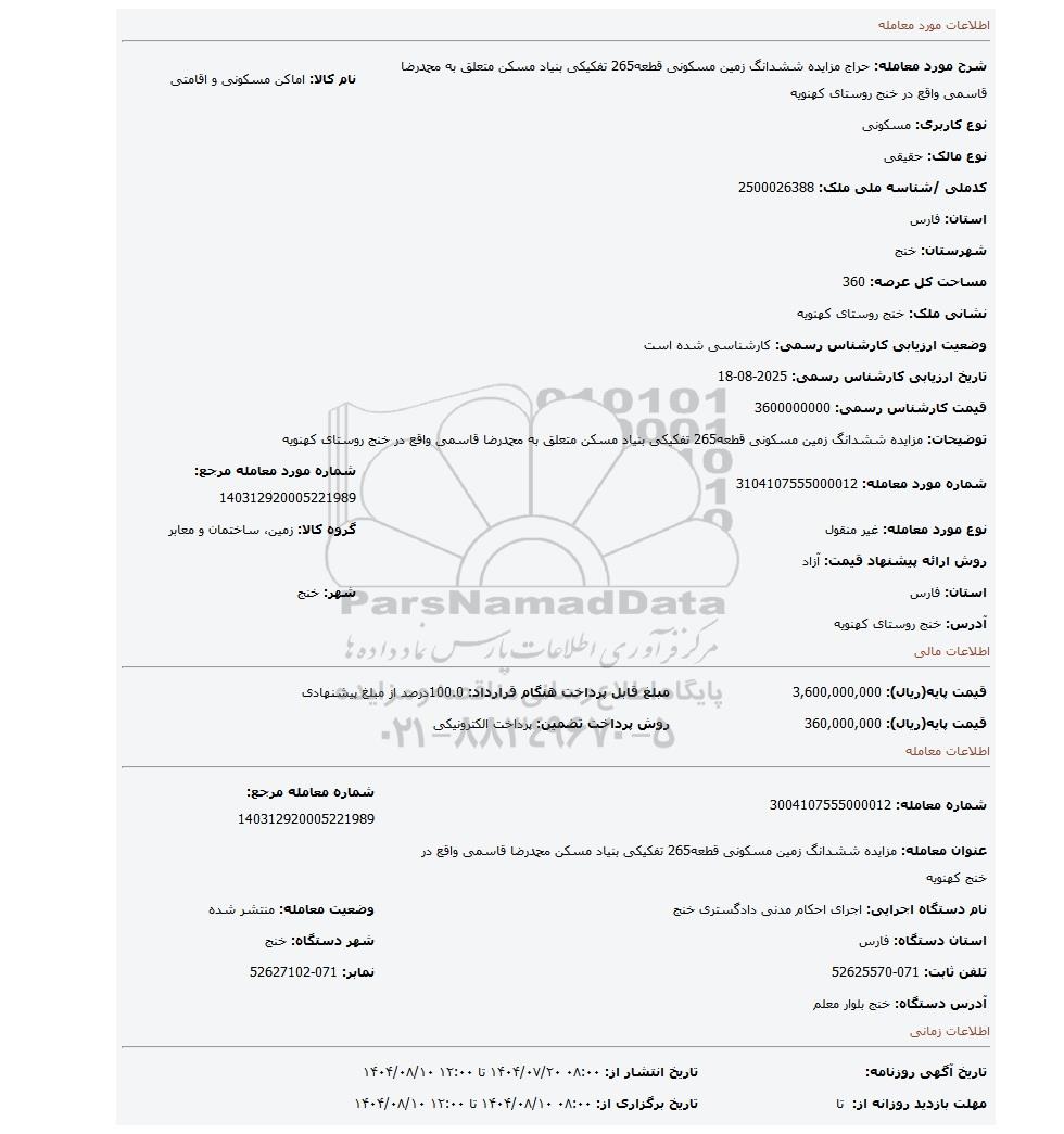 | قیمت پایه(ریال): 360,000,000 | روش پرداخت تضمین: پرداخت الکترونیکی |
