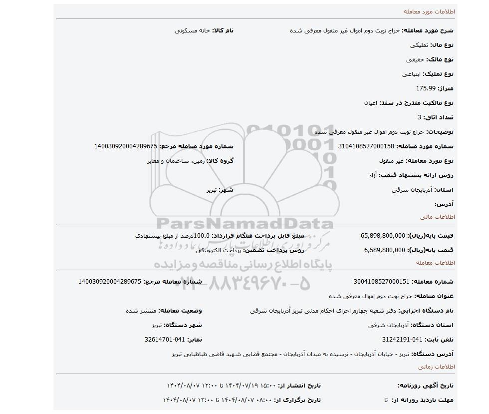 | شماره مورد معامله: 3104108527000158 | شماره مورد معامله مرجع: 140030920004289675 | |