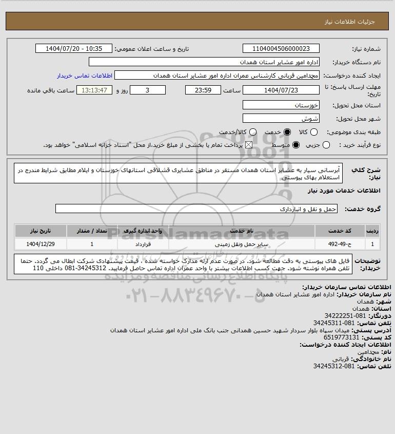 شرح کلی نیاز: آبرسانی سیار به عشایر استان همدان مستقر در مناطق عشایری قشلاقی استانهای خوزستان و ایلام مطابق شرایط مندرج در استعلام بهای پیوستی