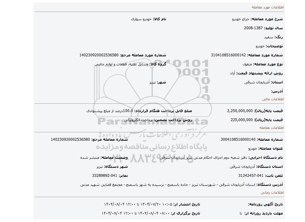 قیمت پایه(ریال): 225,000,000روش پرداخت تضمین: پرداخت الکترونیکی