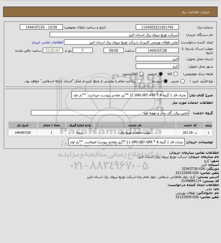 شرح کلی نیاز: بحران فاز 1 گروه 4 * 11.090.087.499 **ریز مقادیر پیوست میباشد. **بار اول