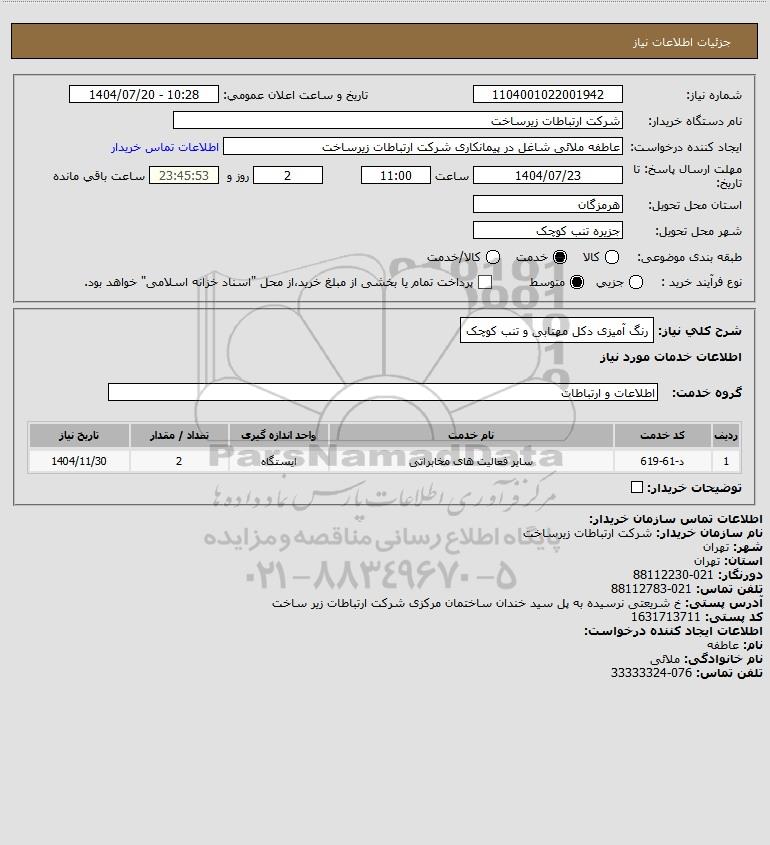 استعلام بها و موضوع استعلام استعلام رنگ آمیزی دکل مهتابی و تنب کوچک به اطلاع کلیه شرکت‌ها و افراد متخصص واجد شرایط می‌رساند، آگهی گذار در نظر دارد از طریق استعلام بها، نسبت به انتخاب و دریافت پیشنهادات اقدام نماید. این استعلام با کد آگهی ثبت شده در سامانه خبرگزاری پارس نماد : 9683760 منتشر شده است. مشخصات استعلام : تاریخ شروع استعلام: 1404/07/20 آخرین مهلت ارسال پیشنهاد قیمت : 1404/07/23 و محل اجرای پروژه : استان هرمزگان میباشد. استعلام قیمت مورد درخواست : استعلام رنگ آمیزی دکل مهتابی و تنب کوچک با دسته‌بندی‌های تخصصی و گروه های مرتبط : پیمانکاری مخابرات, دکل و بی سیم, رنگ آمیزی, استعلام اطلاع رسانی میگردد.