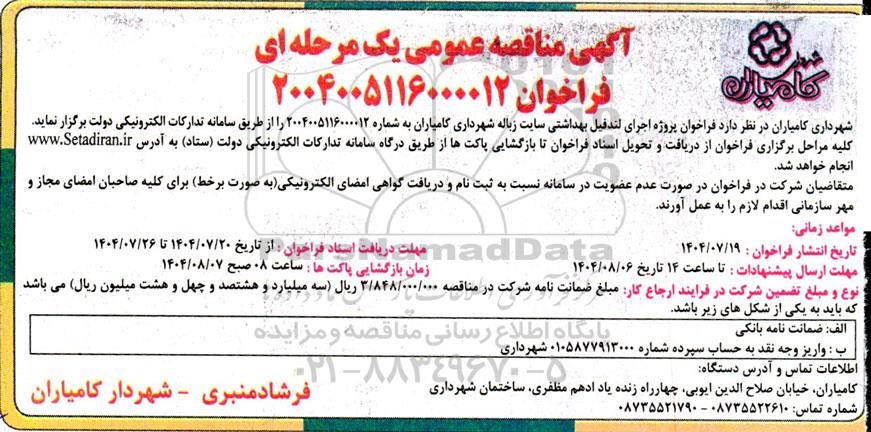 شهرداری کامیاران در نظر دارد فراخوان پروژه اجرای لندفیل بهداشتی سایت زباله شهرداری کامیاران به شماره 2004005116000012 را از طریق سامانه تدارکات الکترونیکی دولت برگزار نماید.
