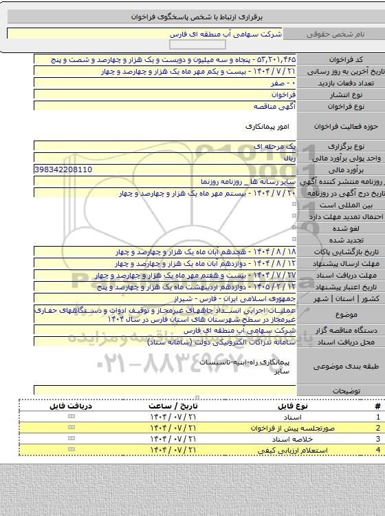مناقصه عملیات اجرایی انسداد چاههای غیرمجاز و توقیف ادوات و دستگاههای حفاری غیرمجاز در سطح شهرستان های استان فارس در سال ۱۴۰۴ از کلیه افراد متخصص و شرکتها واجد شرایط دعوت به عمل میآید در مناقصه با کد خبرگزاری پارس نماد: 9683909 شرکت نمایند.