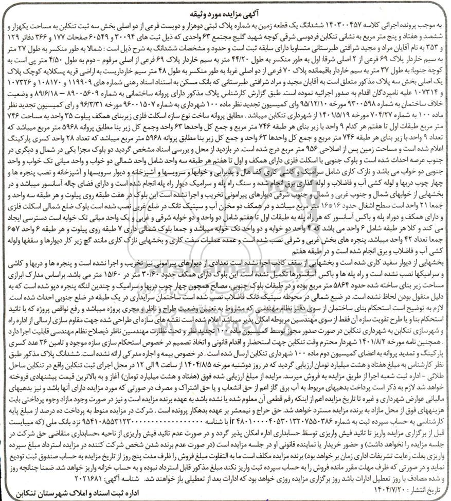 به موجب پرونده اجرائی کلاسه 140300457 ششدانگ یک قطعه زمین به شماره پلاک ثبتی دوهزار و دویست فرعی از دو اصلی بخش سه ثبت تنکابن به مساحت یکهزار و ششصد و هفتاد و پنج متر مربع به نشانی تنکابن فردوسی شرقی کوچه شهید گلیج مجتمع 63 واحدی که ذیل ثبت های 30094 و 60549 صفحات 177 و 366 دفاتر 129 و 353 به نام آقایان مراد و مجید شرافتی طبرستانی متساویا دارای سابقه ثبت است و حدود و مشخصات ششدانگ به شرح ذیل است : شمالا به طور منکسر به طول 27 متر به سیم خاردار پلاک 69 فرعی از 2 اصلی شرقا اول به طور منکسر به طول 44.20 متر به سیم خاردار پلاک 69 فرعی از اصلی مرقوم - دوم به طول 4.50 متر پی است به کوچه جنوبا به طول 37 متر به سیم خاردار باقیمانده پلاک 70 فرعی از دو اصلی غربا به طور منکسر به طول 48 متر سیم خارداریست به اراضی قریه پسکلایه کوچک پلاک یک اصلی بخش سه پلاک مذکور متعلق است به آقایان مجید و مراد شرافتی طبرستانی که بانک مسکن به استناد اسناد رهنی شماره های 119909 و 108170 و 107326 و 107314 علیه نامبردگان اقدام به صدور اجرائیه نموده است. طبق گزارش کارشناس پلاک مذکور دارای پروانه ساختمانی به شماره 89005609 - 89.6.18 و وضعیت خلاف ساختمان به شماره 9300598 مورخه 95.12.10 وای کمیسیون تجدید نظر ماده 100 شهرداری به شماره 96001507 مورخه 96.3.31 و رای کمیسیون تجدید نظر ماده 100 به شماره 704.27 مورخه 1401.5.19 از شهرداری تنکابن میباشد. مطابق پروانه ساخت نوع سازه اسکلت فلزی زیربنای همکف پیلوت 35 واحد به مساحت 746 متر مربع طبقات اول تا هفتم هر کدام 9 واحد با زیر بنای هر طبقه 746 متر مربع و جمع کل واحدها 63 واحد وجمع كل زیر بنا مطابق پروانه 5968 متر مربع میباشد که تعداد 9 واحد با زیر بنای هر طبقه 746 متر مربع و جمع کل واحدها 63 واحد و جمع کل زیر بنا مطابق پروانه 5968 متر مربع میباشد که تعداد 28 واحد کسری پارکینگ اعلام شده است و مساحت زمین پس از اصلاحی 956 متر مربع درج شده است. در بازدید از محل و بررسی اسناد مشخص گردید دو بلوک مجزا یکی در شمال و دیگری در جنوب عرصه احداث شده است و بلوک جنوبی با اسکلت فلزی دارای همکف و اول تا هفتم هر طبقه سه واحد شامل واحد شمالی دو خواب و واحد میانی تک خواب و واحد جنوبی دو خواب میباشد و نازک کاری شامل سرامیک و کاشی کاری کف هال و پذیرایی و خوابها و سرویسها و آشپزخانه و دیوار سرویسها و آشپزخانه و نصب پنجره ها و چهار چوب دربها و لوله کشی آب و فاضلاب و لوله گذاری برق انجام شده و سنگ راه پله و سرامیک دیوار راه پله انجام شده است و دارای فضای چاله آسانسور میباشد و در بخشهایی از خوابهای شمال و جنوب غربی و شمال و جنوب شرقی دیوارهای پیرامونی تخریب و اجرا نشده است این بلوک در هفت طبقه روی پیلوت و هر طبقه سه واحد و جمعا 21 واحد است سطح اشغال حدود 1616 متر مربع میباشد و در همکف دو مخزن آب و سپتیک تانک در ضلع غربی نصب شده است بلوک ضلع شمالی اسکلت فلزی و دارای همکف و دوراه پله و باکس آسانسور که هر راه پله به طبقات اول تا هفتم شامل دو واحد و دو خوابه شرقی و غربی و یک واحد میانی تک خوابه است دسترسی ایجاد می کند و کلا هر طبقه شامل 6 واحد میباشد که 4 واحد دو خوابه و دو واحد تک خوابه میباشد و جمعا بلوک شمالی داری 7 طبقه روی پیلوت و هر طبقه 6 واحد 657 جمعا تعداد 42 واحد میباشد. پنجره های بخش غربی و شرقی نصب شده است و عمده عملیات سفت کاری و بخشهایی نازک کاری مانند گچ زیر کار دیوارها و سقفها ولوله کشی آب و فاضلاب و برق انجام شده است و در طبقه هفتم