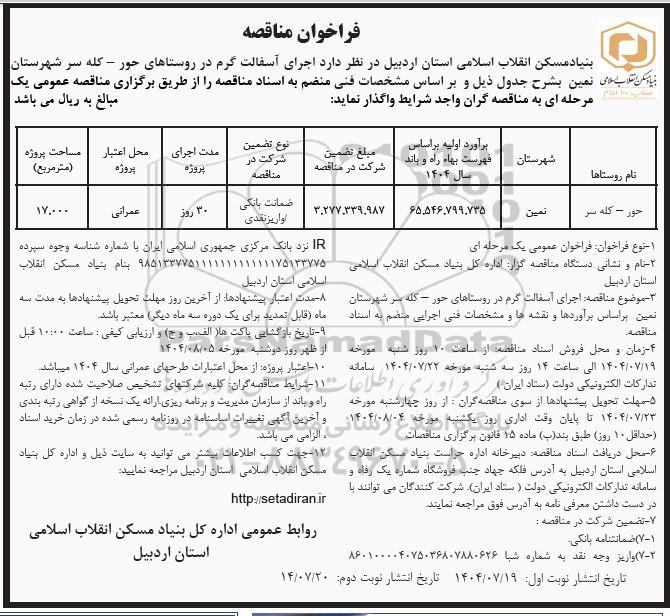 بنیاد مسکن انقلاب اسلامی استان اردبیل در نظر دارد اجرای آسفالت گرم در روستاهای حور- کله س ر شهرستان نمین  به شرح جدول ذیل و براساس مشخصات فنی منضم به اسناد مناقصه را از طریق برگزاری مناقصه عمومی یک مرحله ای به مناقصه گران واجد شرایط واگذار نماید. (مبالغ به ریال می باشد):