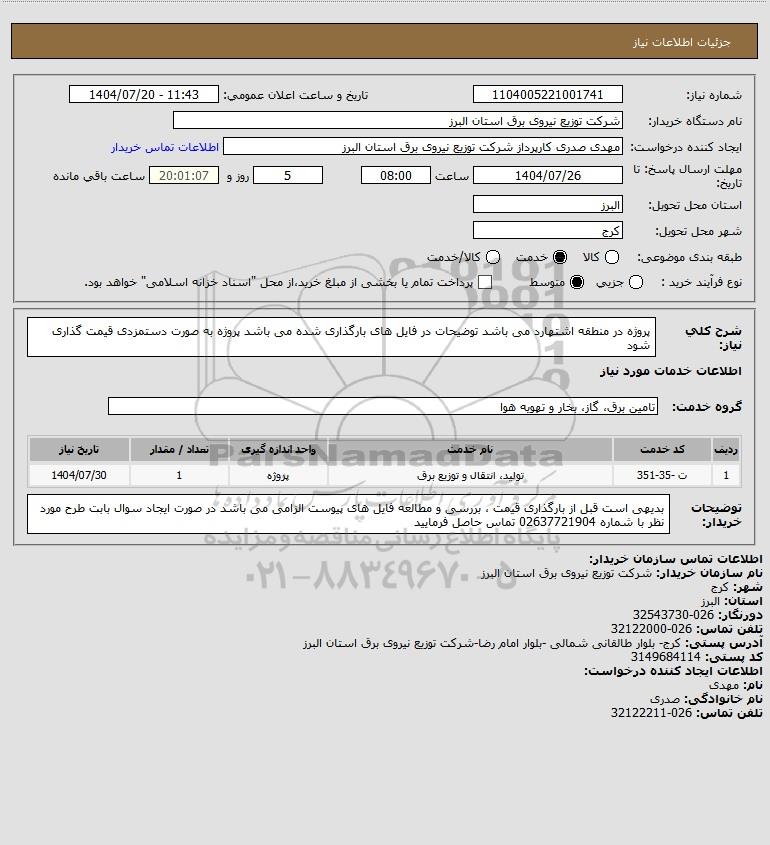 شرح کلی نیاز: پروژه در منطقه اشتهارد می باشد
