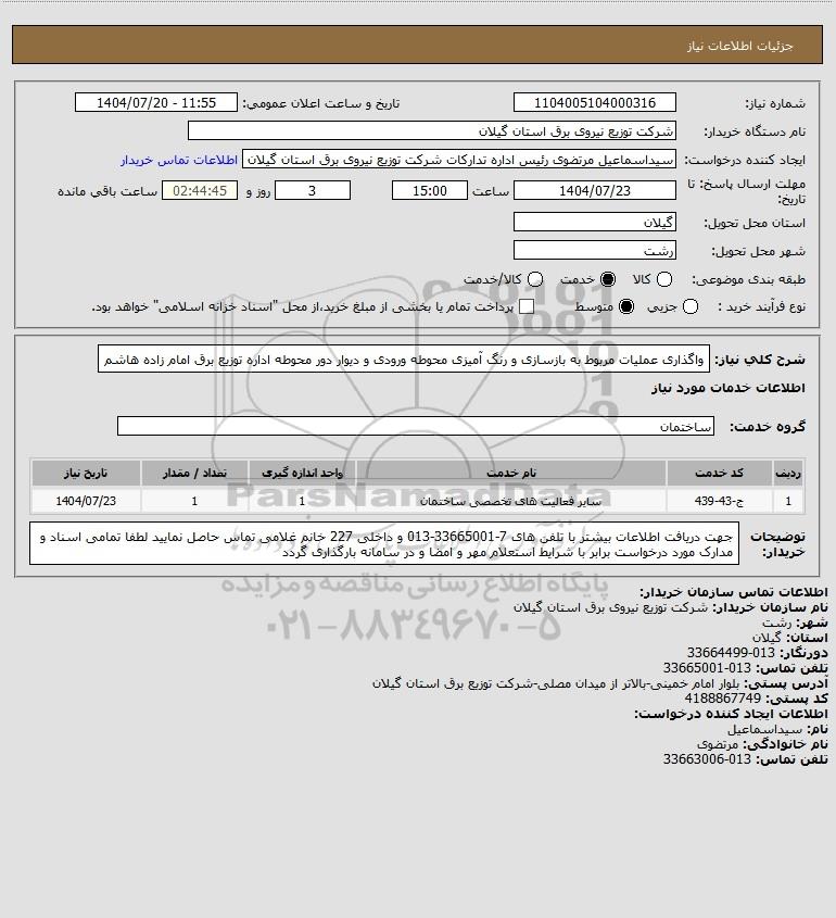 شرح کلی نیاز: واگذاری عملیات مربوط به بازسازی و رنگ آمیزی محوطه ورودی و دیوار دور محوطه اداره توزیع برق امام