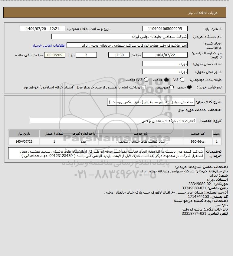 شرح کلی نیاز: سنجش عوامل زیان آور محیط کار ( طبق عکس پیوست )