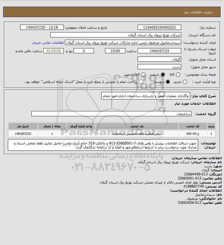 شرح کلی نیاز: واگذاری عملیات تعمیر و بازسازی ساختمان اداری-امور خمام