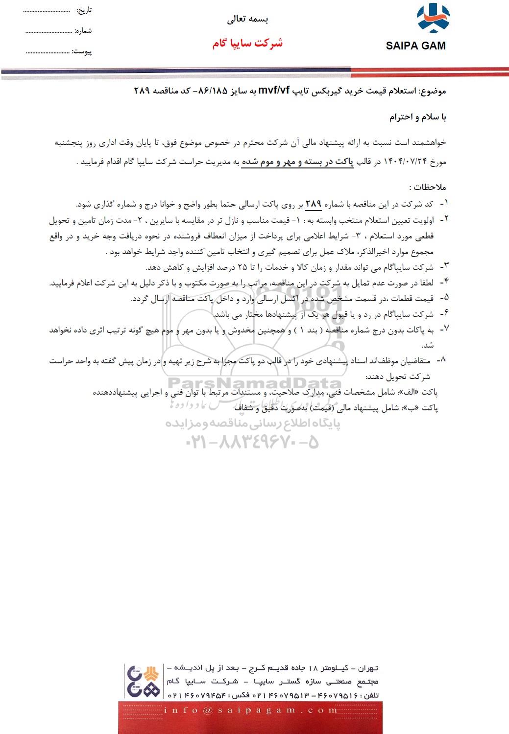 موضوع: استعلام قیمت خرید گیربکس تایپ mvf/vf به سایز 86/185 - کد مناقصه 289