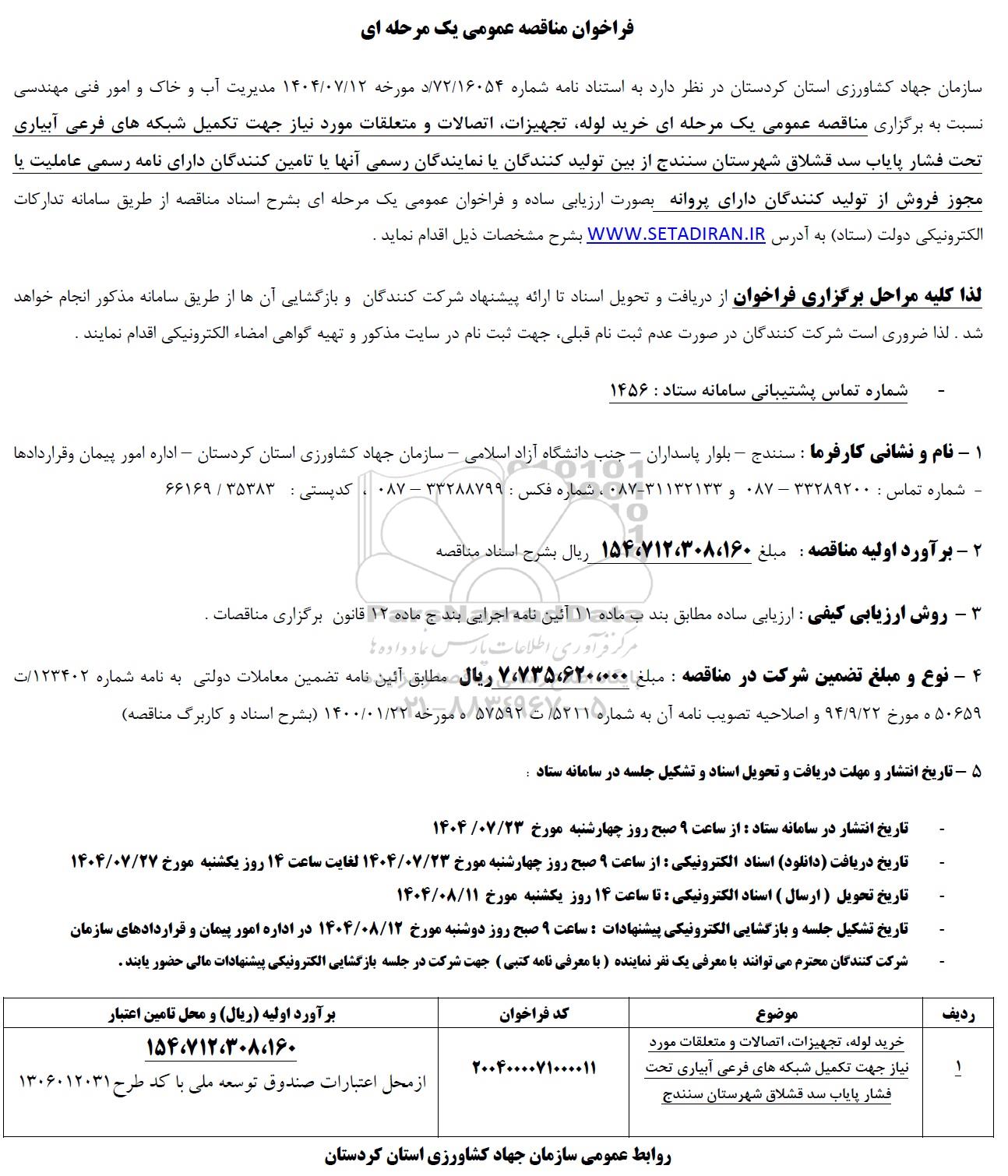 سازمان جهاد کشاورزی استان کردستان در نظر دارد به استناد نامه شماره 72.16054 د مورخه 1404.07.12 مدیریت آب و خاک و امور فنی مهندسی نسبت به برگزاری مناقصه عمومی یک مرحله ای خرید لوله، تجهیزات، اتصالات و متعلقات مورد نیاز جهت تکمیل شبکه های فرعی آبیاری تحت فشار پایاب سد قشلاق شهرستان سنندج از بین تولید کنندگان یا نمایندگان رسمی آنها یا تامین کنندگان دارای نامه رسمی عاملیت یا مجوز فروش از تولید کنندگان دارای پروانه بصورت ارزیابی ساده و فراخوان عمومی یک مرحله ای بشرح اسناد مناقصه از طریق سامانه تدارکات الکترونیکی دولت (ستاد) به آدرس ستاد ایران بشرح مشخصات ذیل اقدام نماید .