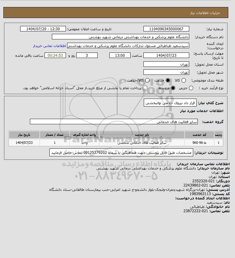شرح کلی نیاز: قرار داد نیروی حجمی توانبخشی