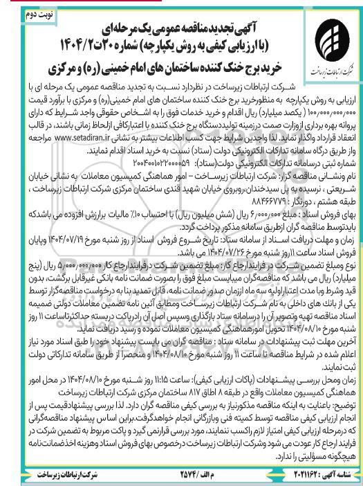 شرکت ارتباطات زیر ساخت در نظر دارد نسبت به تجدید مناقصه عمومی یک مرحله ای با ارزیابی به روش یکپارچه به منظور خرید برج خنک کننده ساختمان های امام خمینی (ره) و مرکزی با برآورد قیمت 100.000.000.000 ( یکصد میلیارد ریال) اقدام و خرید خدمات فوق را به اشخاص حقوقی واحد شرایط که دارای پروانه بهره برداری از وزارت صمت در زمینه تولید دستگاه برج خنک کننده با اعتبار کافی از لحاظ زمانی باشند. در قالب انعقاد قرارداد واگذار نماید. لذا واجدین شرایط جهت کسب اطلاعات بیشتر به نشانی ستاد ایران مراجعه و از طریق درگاه سامانه تداركات الکترونیکی دولت ستاد نسبت به خرید اسناد اقدام نمایند.