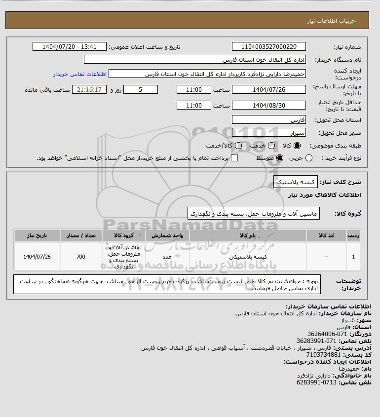 | 1 | -- | کیسه پلاستیکی | عدد | ماشین آلات و ملزومات حمل، بسته بندی و نگهداری | 700 | 1404/07/26 |