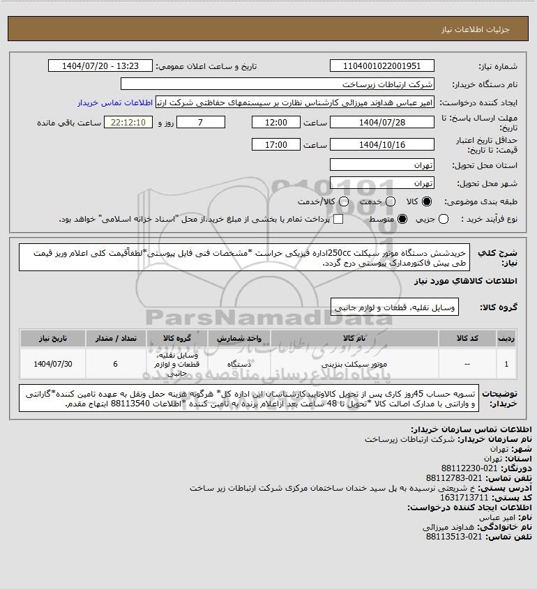 شرح کلی نیاز: خریدشش دستگاه موتور سیکلت 250ccاداره فیزیکی حراست *مشخصات فنی فایل پیوستی*لطفاًقیمت کلی اعلام وریز قیمت طی پیش فاکتورمدارک پیوستی درج گردد.