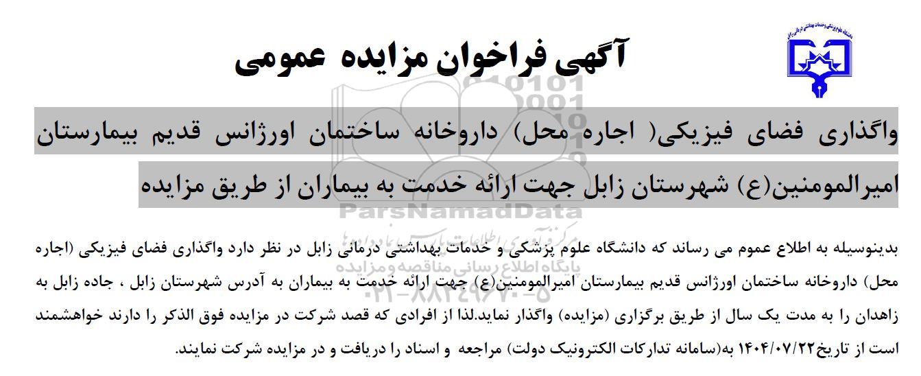 بدینوسیله به اطلاع عموم میرساند که دانشگاه علوم پزشکی و خدمات بهداشتی درمانی زابل در نظر دارد واگذاری فضای فیزیکی (اجاره محل) داروخانه ساختمان اورژانس قدیم بیمارستان امیرالمومنین (ع) جهت ارائه خدمت به بیماران به آدرس شهرستان زابل، جاده زابل به زاهدان را به مدت یک سال از طریق برگزاری مزایده واگذار نماید. لذا از افرادی که قصد شرکت در مزایده فوق الذکر را دارند خواهشمند است از تاریخ 1404.07.22 به سامانه تدارکات الکترونیک دولت مراجعه و اسناد را دریافت و در مزایده شرکت نمایند .